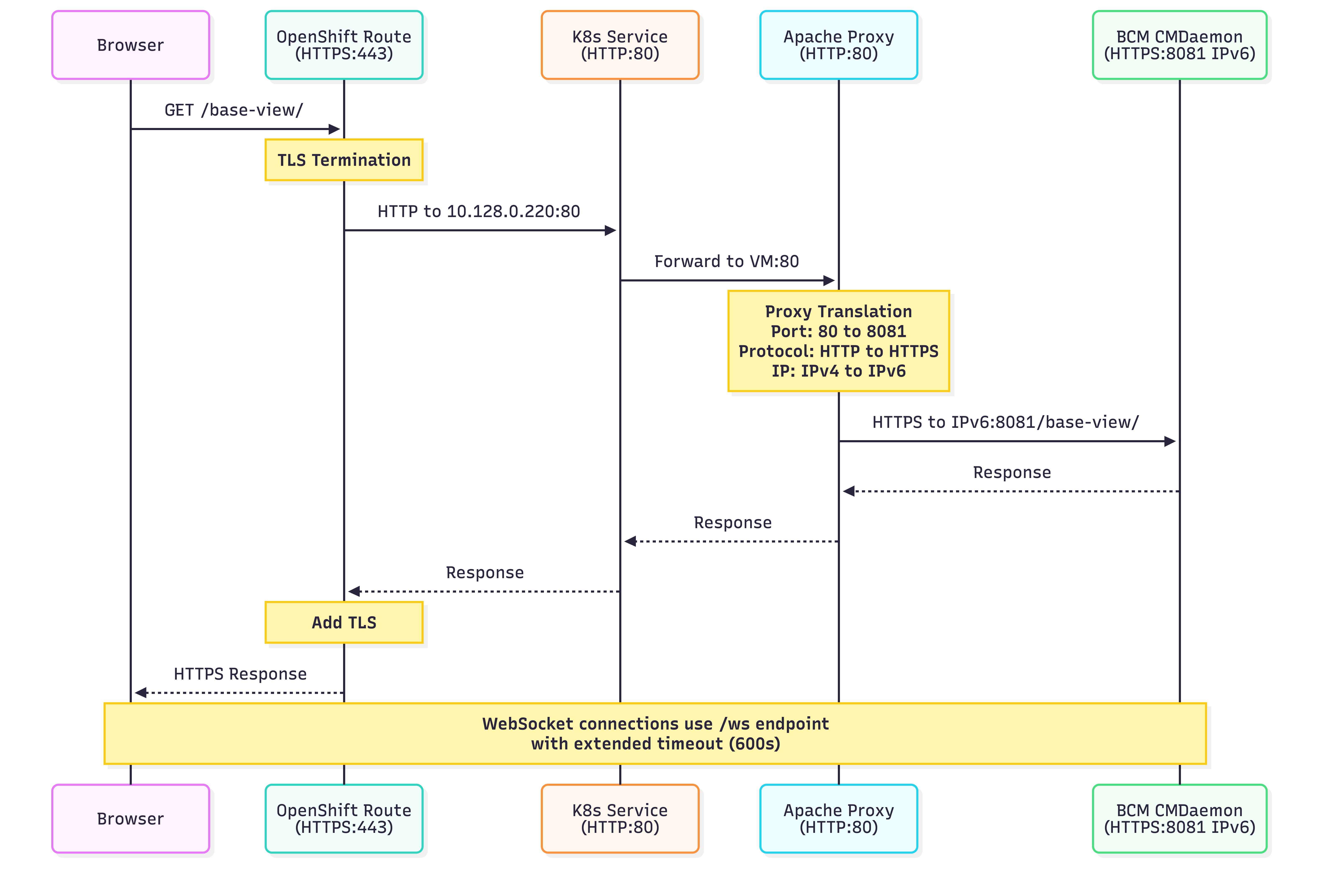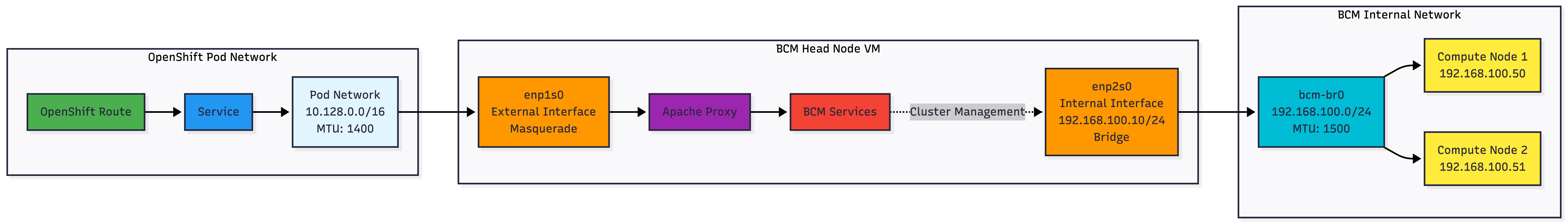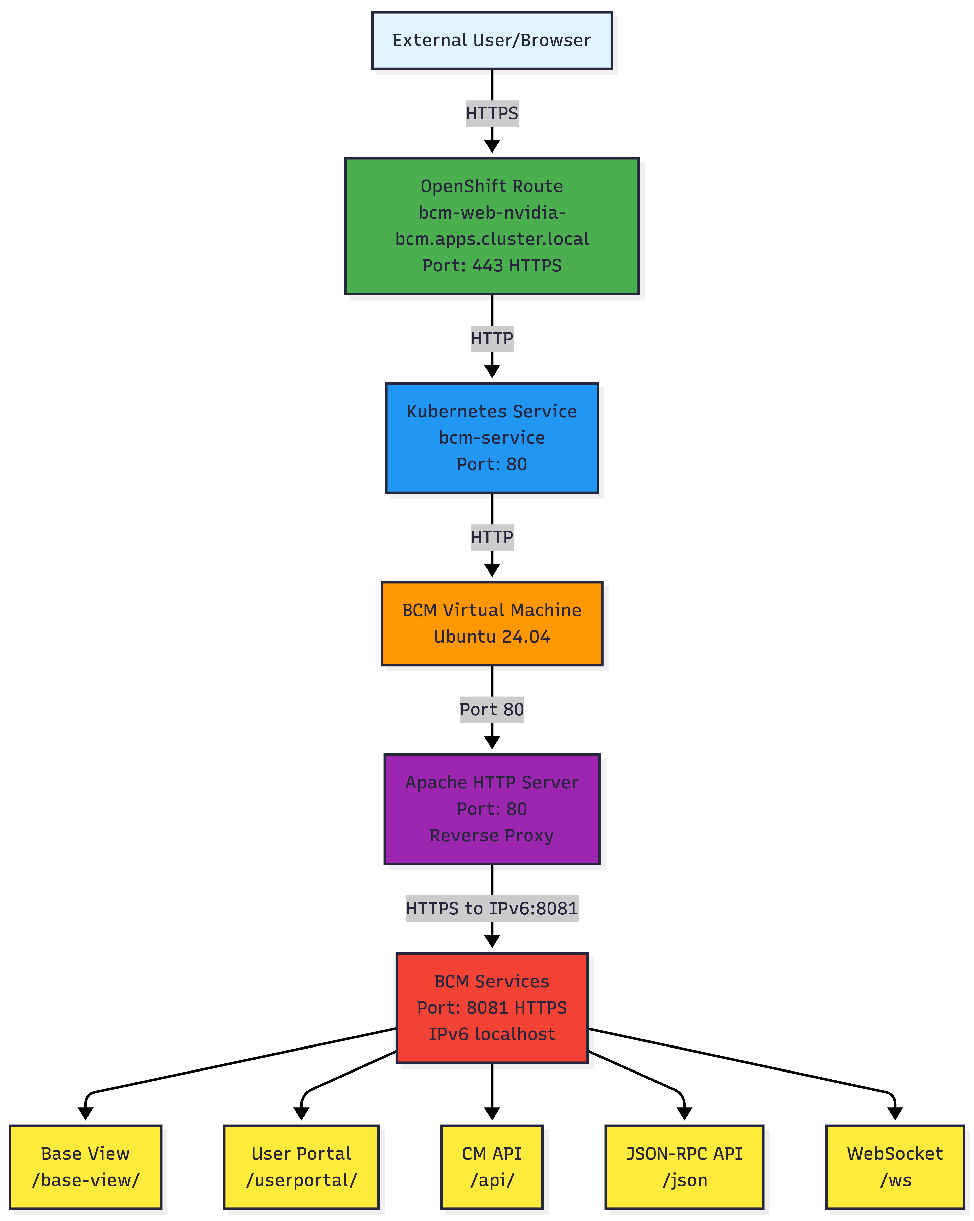 - Reverse proxy needs: Apache bridges the gap between BCM and OpenShift networking